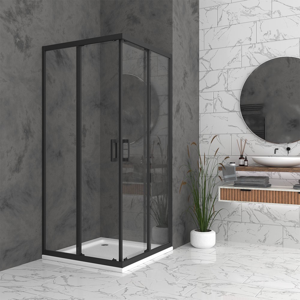 Душ кабина Бела S с размери 120/120/195см. Модела е квадрат с кристално стъкло 6мм. с две врати на плъзгане , двойни долни ролки и горни ролки с лагери магнитна лента , дръжка двойна Soft-stop стопери , алуминиев профил в черен мат.