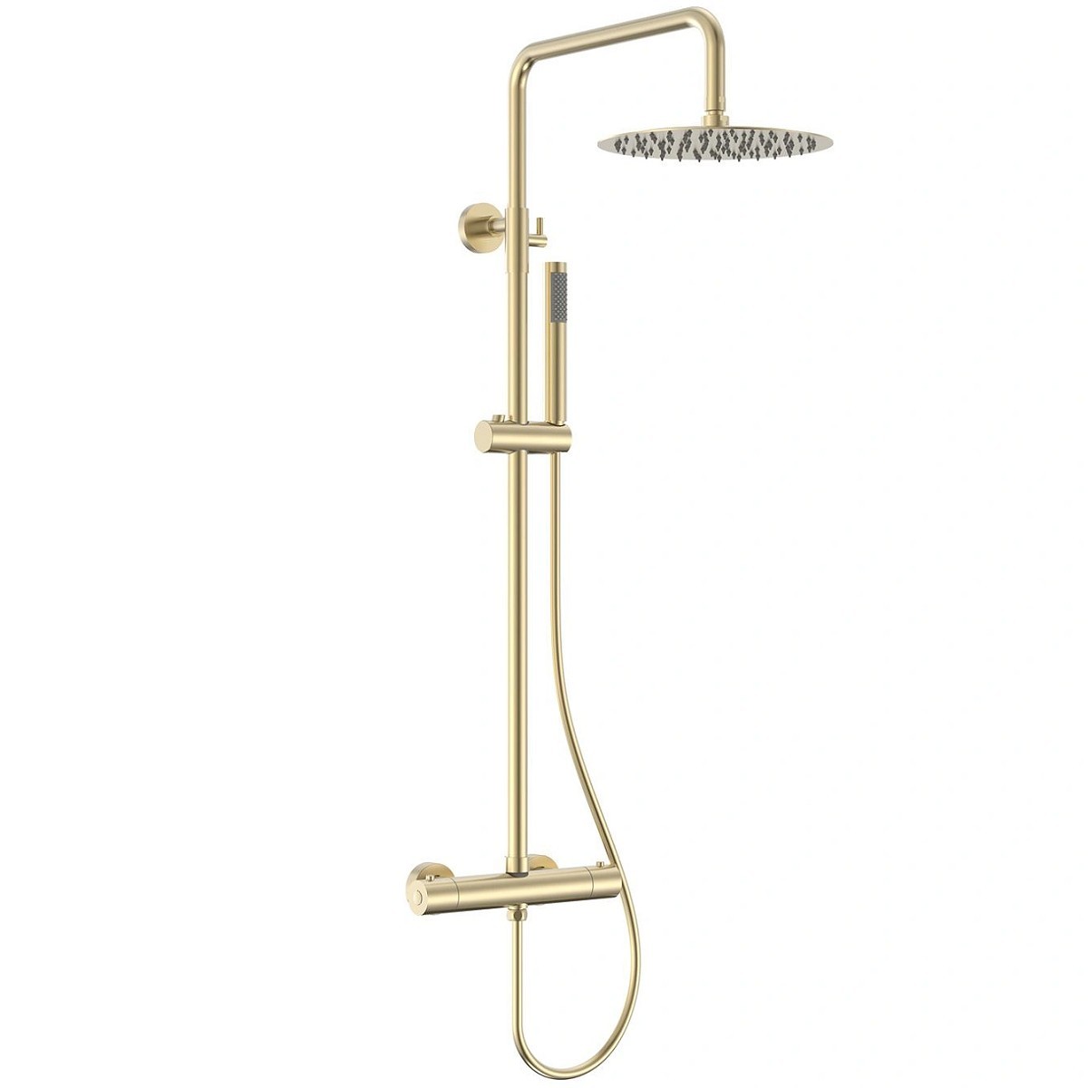 Душ колона в злато термостатична Artemis Oro SC418M/1243. Смесител за вана и душ стенен термостатичен с аксесоари. Душ глава/пита ф30см. кръг еднофункционална с рамо 37.5см. Стационарно душ слушалка стик еднофункционална. Окачалка и шлаух PVC 150см. Телескопично тръбно окачване с регулируема височина 85-124.5см. Неръждаема стомана SC418M/1243Oro/5206836751870