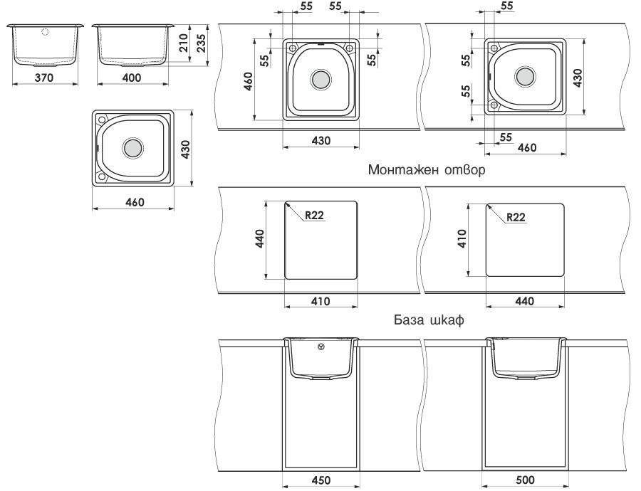 Кухненска мивка за вграждане Класик 43/46/h21см. единична цвят 02 Полярен гранит полимермрамор с включен сифон ф90мм. с преливник 21702