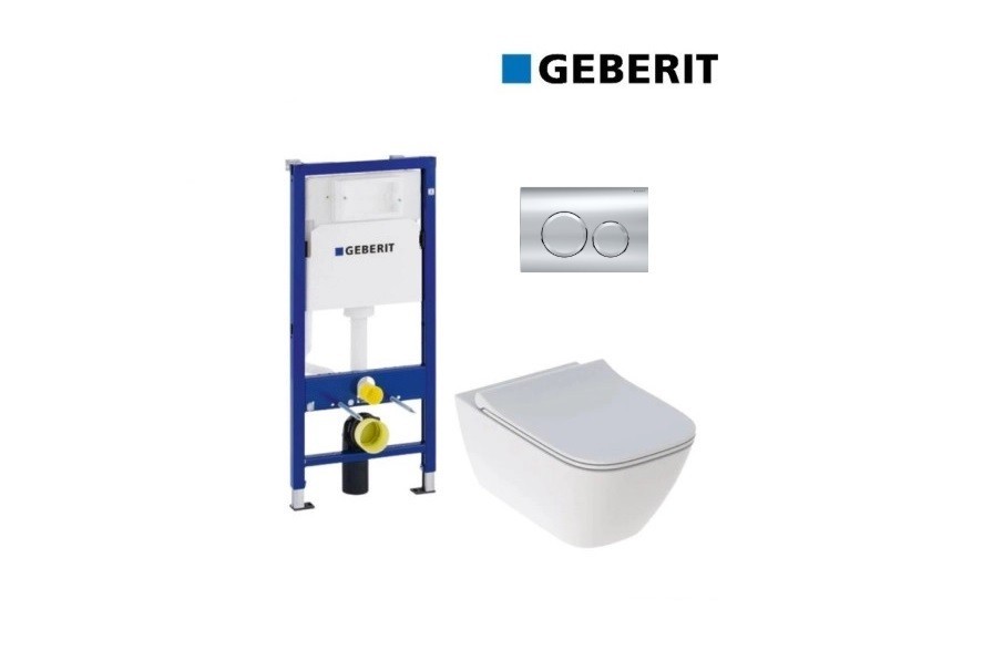 Промо Geberit структура за вграждане Duofix Delta с размер 50/h112см. 458.103.00.1/New 458.103.00.2/111.153.00.3+111.815.00.1/. Модела включва: Бутон двоен Delta 20 с размер 24.6/h16.4см. кръг хром лъскав 115.127.21.1. Стенна тоалетна чиния Smyle Square Rimless/без ръб с размер 37.5/54/h33см. и капак забавено падане в бяло 500.685.01.1.