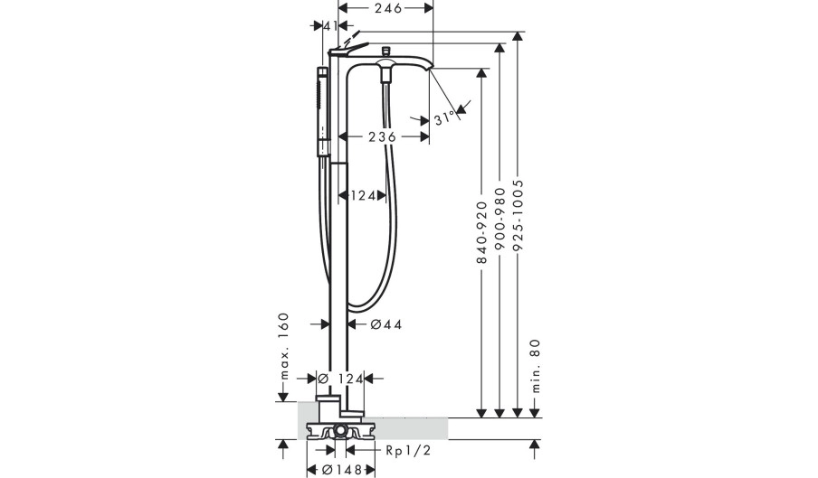 Смесител за вана/душ Vivenis стоящ от пода едноръкохватков с аксесоари душ слушалка двуфункционална /Rain, MonoRain/ шлаух и окачалка бял мат външна част 75445700/White matt Забележка: окомплектова се с кутия/вътрешна част