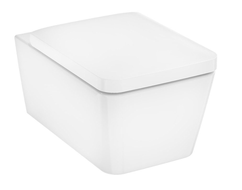 Стенна тоалетна чиния EluPura Q Rimless с размери 36.6/54см. Rimless/Без ръб , задно/хоризонтално оттичане , порцеланова бял гланц с капак забавено падане в бяло.