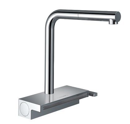 Смесител за кухня Aquno Select M81 с размери 21.5/22.9/h28.1см. стоящ едноръкохватков висок L-образен изтеглящ чучур h=25см. ComfortZone 250 струя тип SatinFlow , вграден възвратен клапан sBox за плавно и защитено насочване на шлауха в шкафа под плота без изпразнител хром/Chrome.