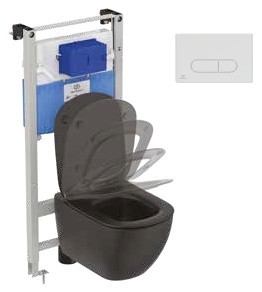 Промо комплект Tesi Silk Black R0523V3: Стенна тоалетна чиния Tesi AquaBlade с размери 36.5/53.5/h33.5см. скрито присъединяване черен мат T0079V3. Капак и седалка Tesi Ultra Slim с размери 36.5/44.5/5см. забавено падане дуропласт черен мат с Easy Take Off крепежи T3527V3/Black matt. Стуктура за вграждане ProSys 120P R027767. Бутон OLEAS P1 пневматичен двоен хром R0116AA. Промо R0523V3+R0116AA/Chrome.