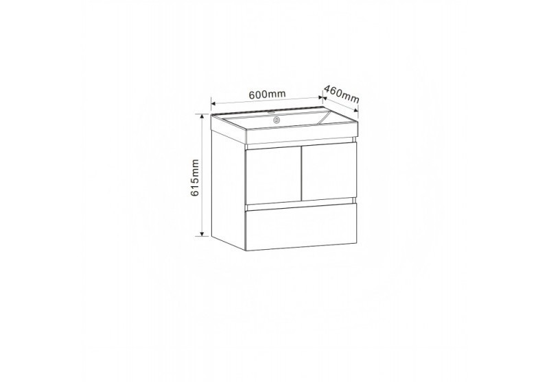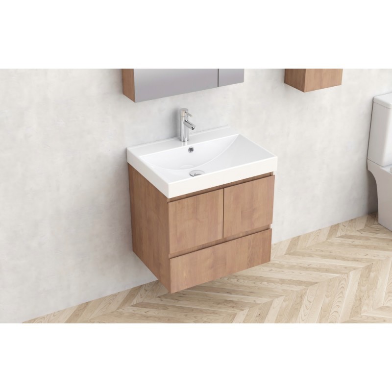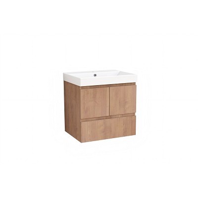 Шкаф долна част Bettino-60см. 9047-60 с размери 60/46/h61.5см. Окачен PVC дървесен цвят PS001 с меламиново покритие с 2 врати и 1 чекмедже водачи DTC с механизъм soft close PVC U-канал и мивка 5953W-2NEW порцеланова бяла с отвор за смесител
