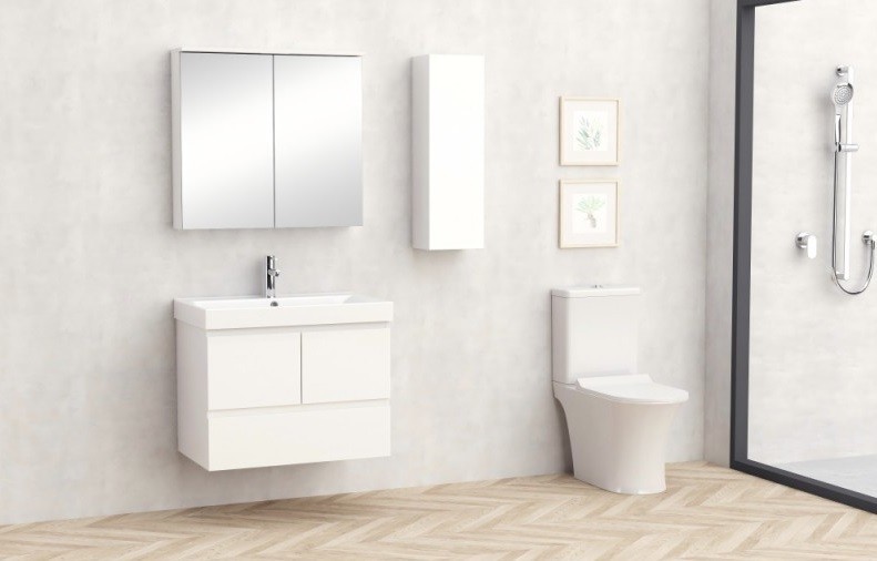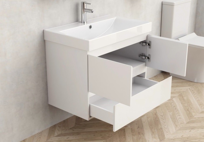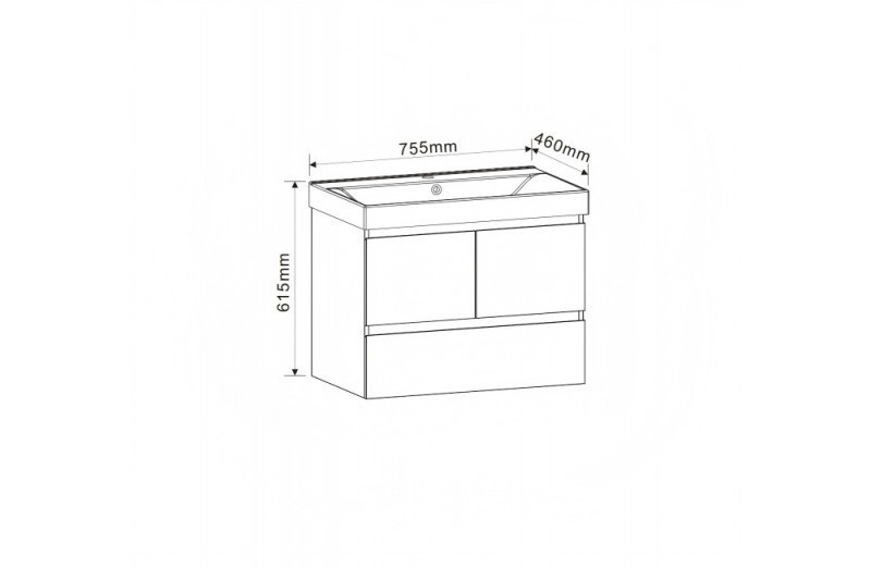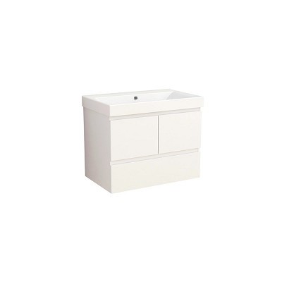 Шкаф долна част Ambrogio-75см. 9048-75W с размери 75.5/46/h61.5см. Окачен PVC бял гланц , шкаф с 2 врати, 1 чекмедже и soft-close механизми, панти и водачи DTC. Изработен от PVC -5 мм гръб, 15 мм панели, боядисан само отвън. Доставя се сглобен с мивка 5953W-76СМ порцеланова бяла с отвор за смесител.