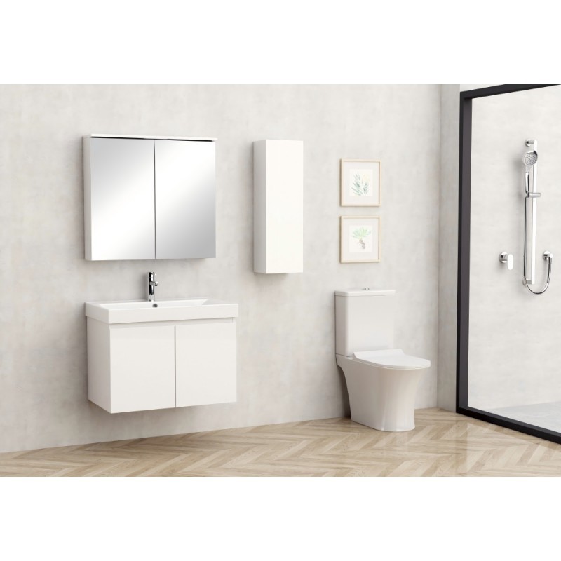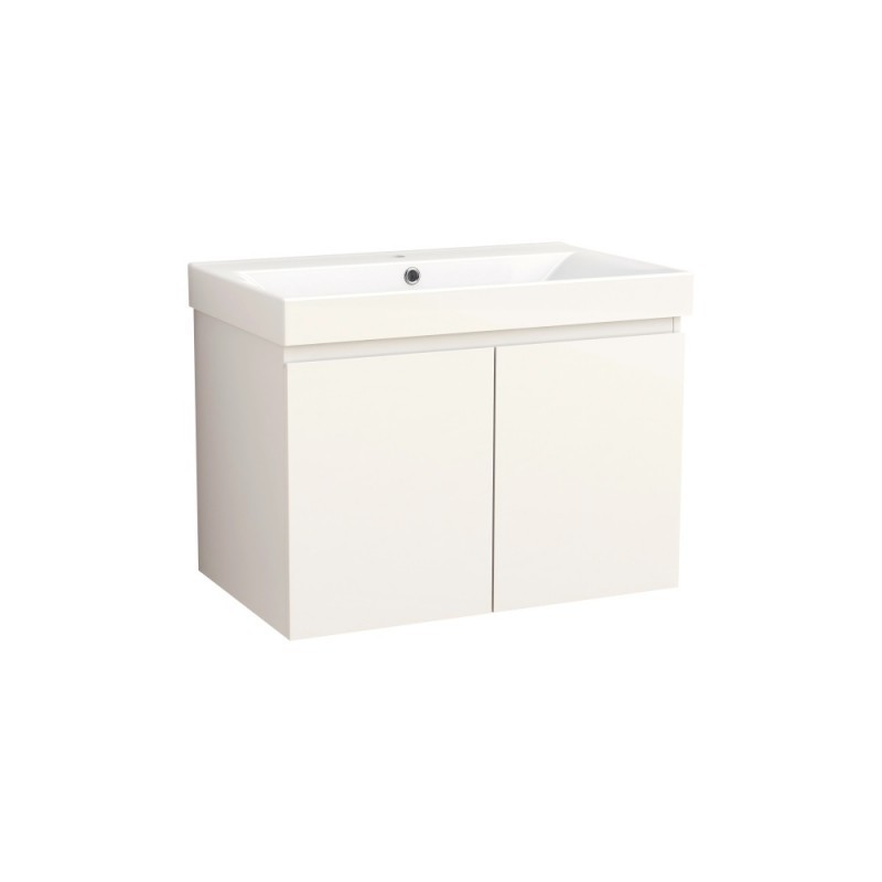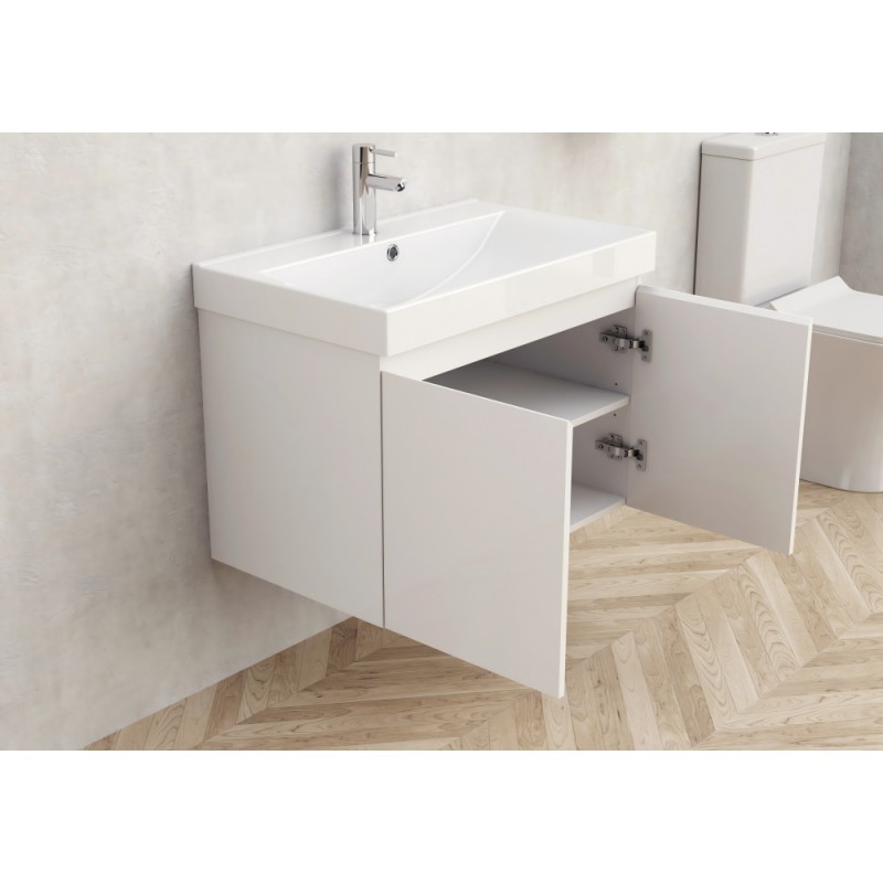 Шкаф долна част Aldene-75см. 5155-75W с размер 75.5/46/h56см. Окачен PVC бял гланц , по модел 5155 с 2 врати, панти DTC с плавно затваряне. Изработен от PVC-5 мм гръб, 15 мм панели, боядисан само отвън. Доставя се сглобен с керамична бяла мивка 5953W-76CM. и отвор за смесител.