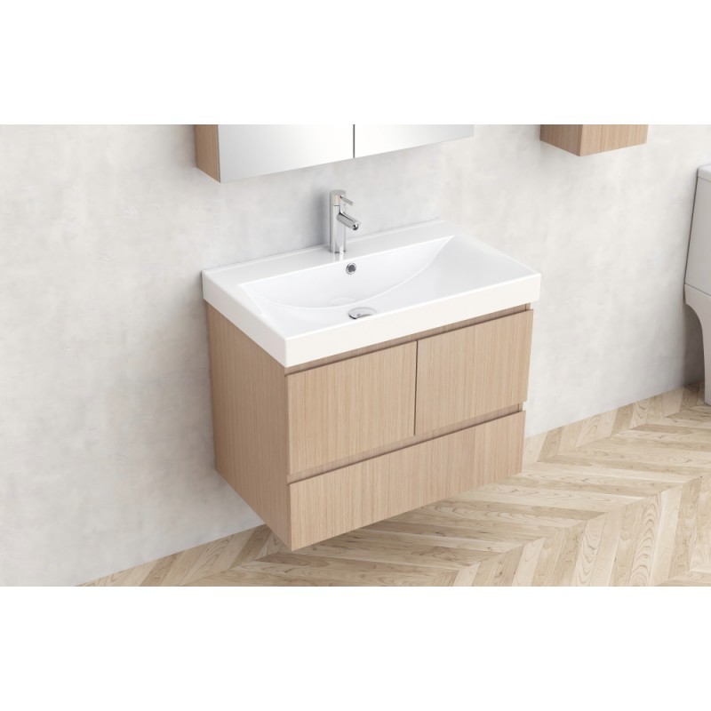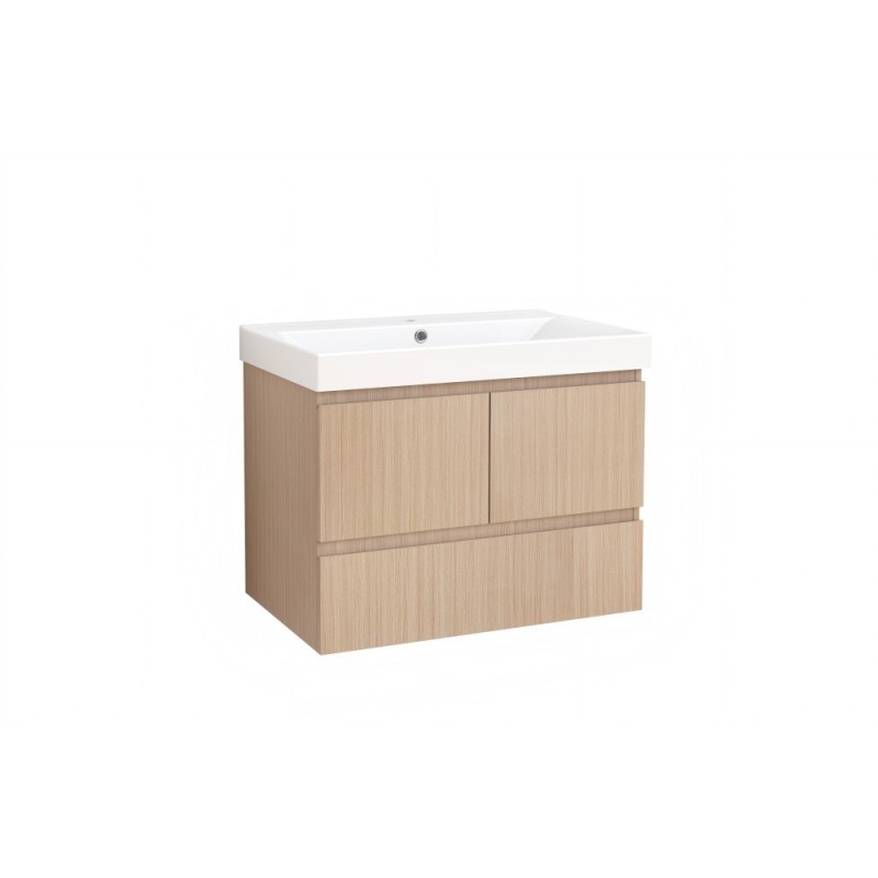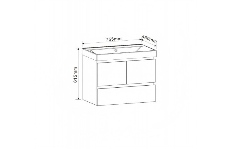 Шкаф долна част Davide-75см. 9046-75 с размер 75/46/h56см. Окачен PVC покритие дърво-меламин с 2 врати и 1 чекмедже. Оборудван с панти и водачи DTC с плавно затваряне, пластмасов U-канал и PVC корпус с боядисан външен слой. Доставя се сглобен, с включена керамична бяла мивка 5953W-76CM с отвор за смесител.