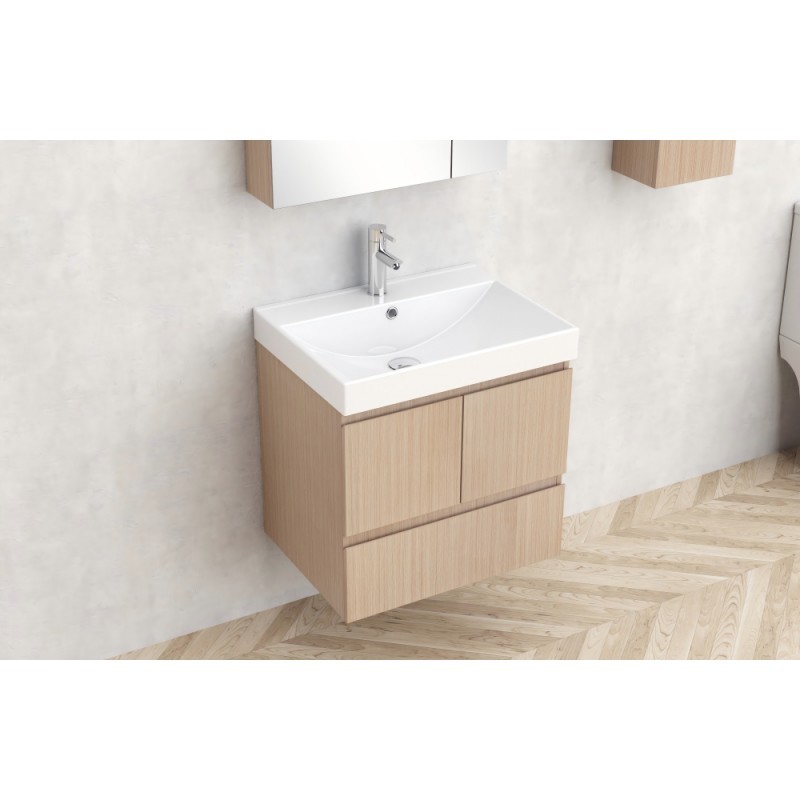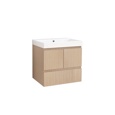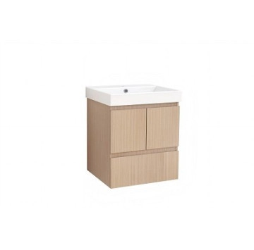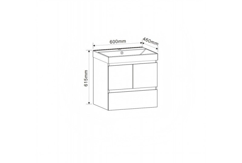 Шкаф долна част Davide-60см. 9046-60 с размер 60/46/h56см. Окачен PVC покритие дърво-меламин с 2 врати и 1 чекмедже. Оборудван с панти и водачи DTC с плавно затваряне, пластмасов U-канал и PVC корпус с боядисан външен слой. Доставя се сглобен, с включена керамична бяла мивка 5953W-2NEW с отвор за смесител.
