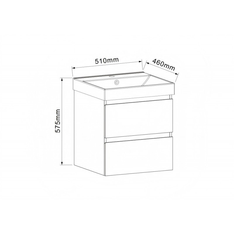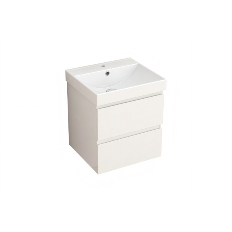 Шкаф долна част Akadia-50см. 6038-50W с размер 50/46/h57.5см. Окачен PVC бял с 2 чекмеджета с релси DTC със soft-close и пластмасов U-канал. PVC конструкция – 15мм панели и 5мм гръб. Боядисан отвън, доставя се сглобен с керамична бяла мивка 5953W-51CM с отвор за смесител.