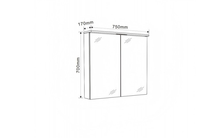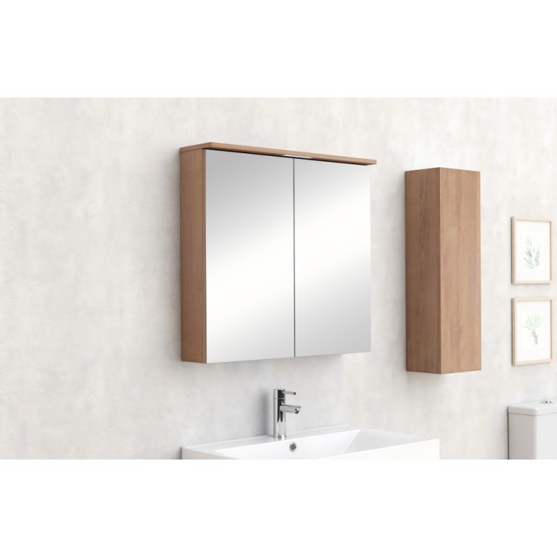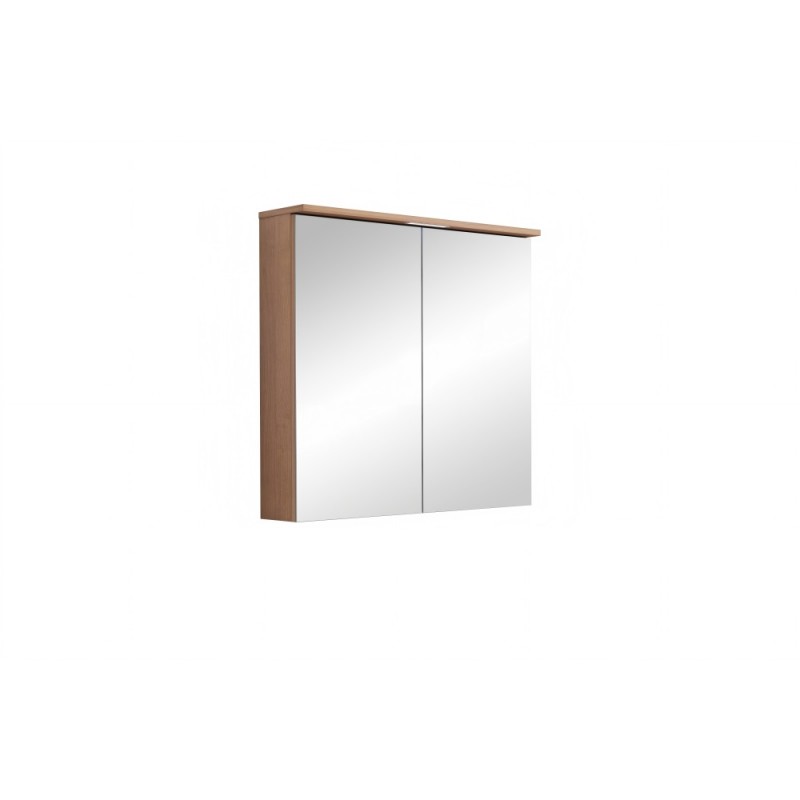 Шкаф горна част Aniela-75см. 6019-75 с размери 75/17/h70см.PVC Огледало в дървесен цвят PS001 с меламиново покритие две врати ляво отваряне DTC панти с механизъм soft close и LED осветление IP44 сглобен 6019-75