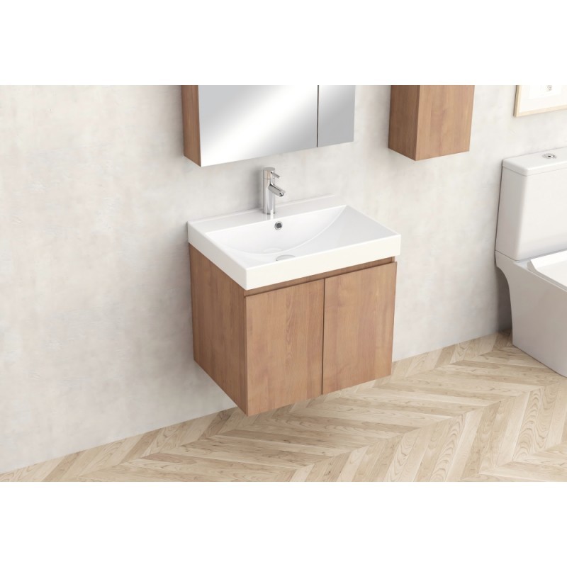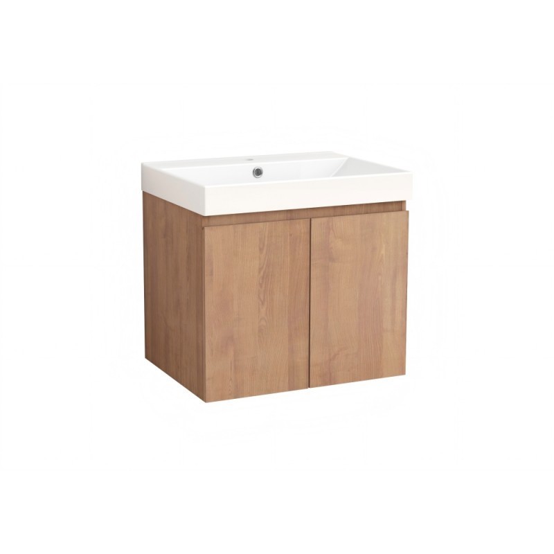 Шкаф долна част Aniela-60см. 5156-60 с размери 60/46/h56см. Окачен PVC дървесно покритие-меламин цвят PS001 с 2 врати с плавно затваряне, панти DTC и боядисано PVC покритие , панели 15мм гръб 5мм. Доставя се сглобен, с включена керамична бяла мивка 5953W-2NEW с отвор за смесител.