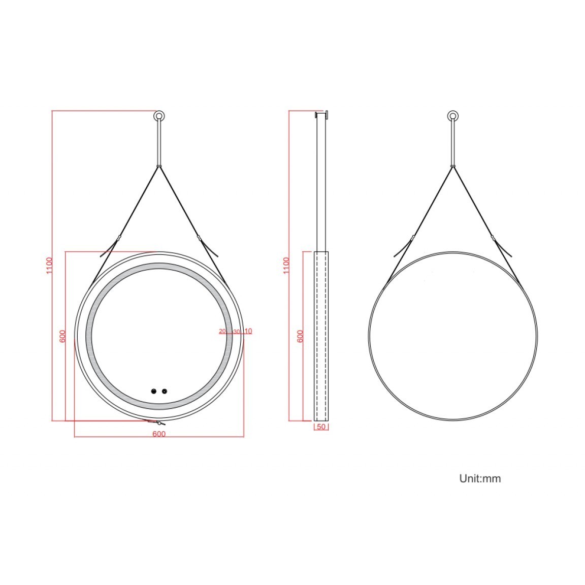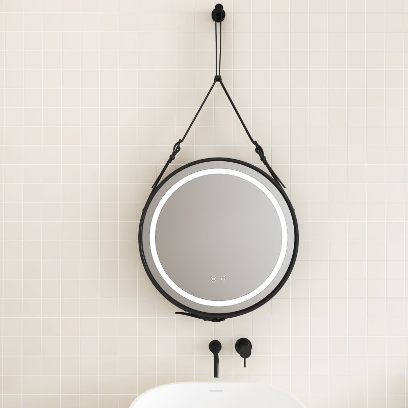 Огледало Catania-60 1398MB-60 ф60см. рамка и държач кожени цвят черен мат с вградено LED осветление Touch бутон 6500K IP44 1613LM дължина на LED лентата 140см. Нагревател Покритие против замъгляване вертикален монтаж с включени крепежни елементи и закачалка за стена черен мат 1398MB-60/6988354277269