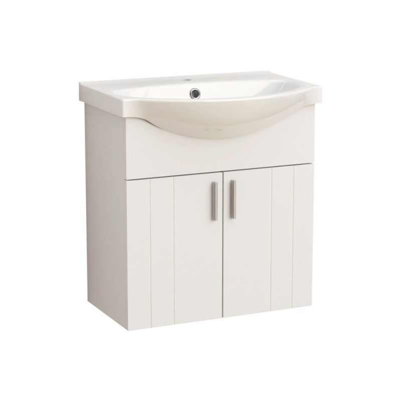 Шкаф долна част Gema 5650 с размери 56.5/42/h60см. Окачен PVC бял гланц две врати с механизъм soft close и дръжки 10см. Мивка 5615 порцеланова бяла с отвор за смесител и преливник 5650/6988354276798/White