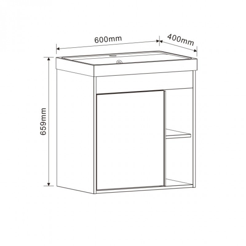 Разполага с една врата с DTC панти и механизъм Soft-Close с един вътрешен рафт, както и два отворени рафта (ниши).