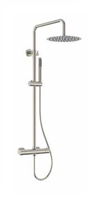 Душ колона Artemis Inox Satinato SC418M/1202. Модела се състои от: Смесител за вана и душ стенен, термостатичен с аксесоари. Душ глава ф30см. кръг еднофункционална с рамо 37.5см. стационарно. Душ слушалка стик еднофункционална. Окачалка Шлаух PVC 150см. Телескопично тръбно окачване с регулируема височина 85-124.5см. неръждаема стомана INOX S/S 304 цвят инокс сатен.