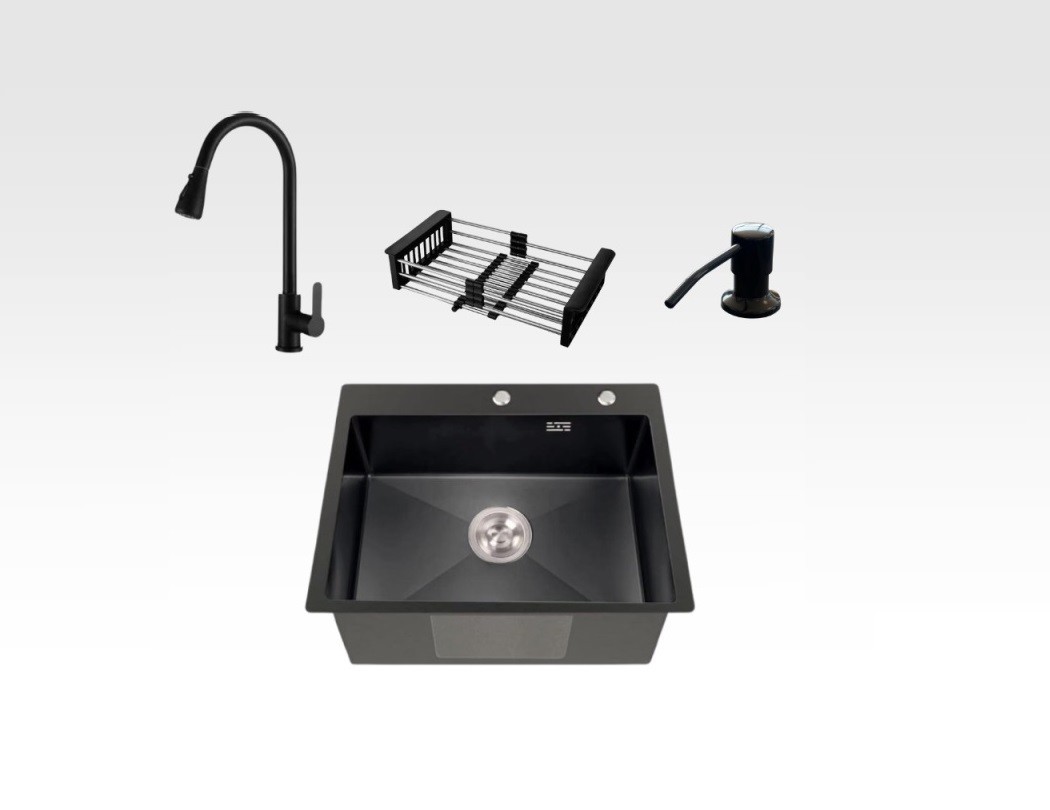 Комплект кухненска мивка 5136/3573 черен/графит – със смесител, дозатор и отцедник.