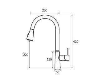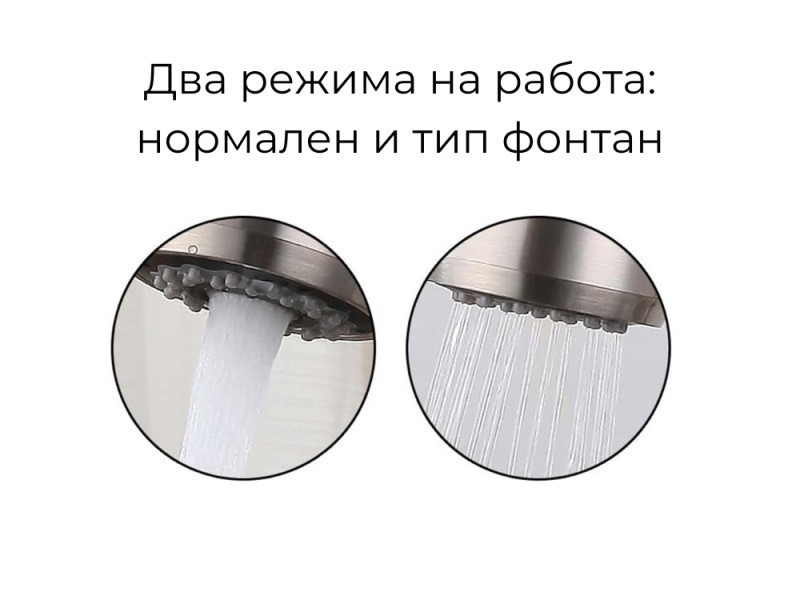 Смесителят е с изтеглящ маркуч, осигуряващ по-лесно миене на големи съдове с два режима на работа - нормален и тип фонтан.