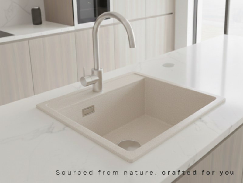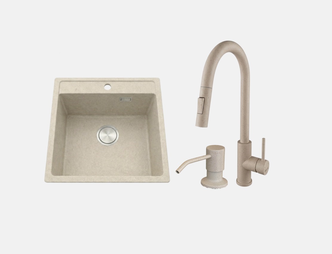 Комплект кухненска мивка, смесител и дозатор в бежов гранит Oatmetal – модел 17630.