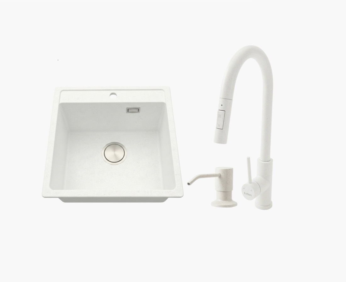 Комплект кухненска мивка, смесител и дозатор в бял гранит – модел 17620.