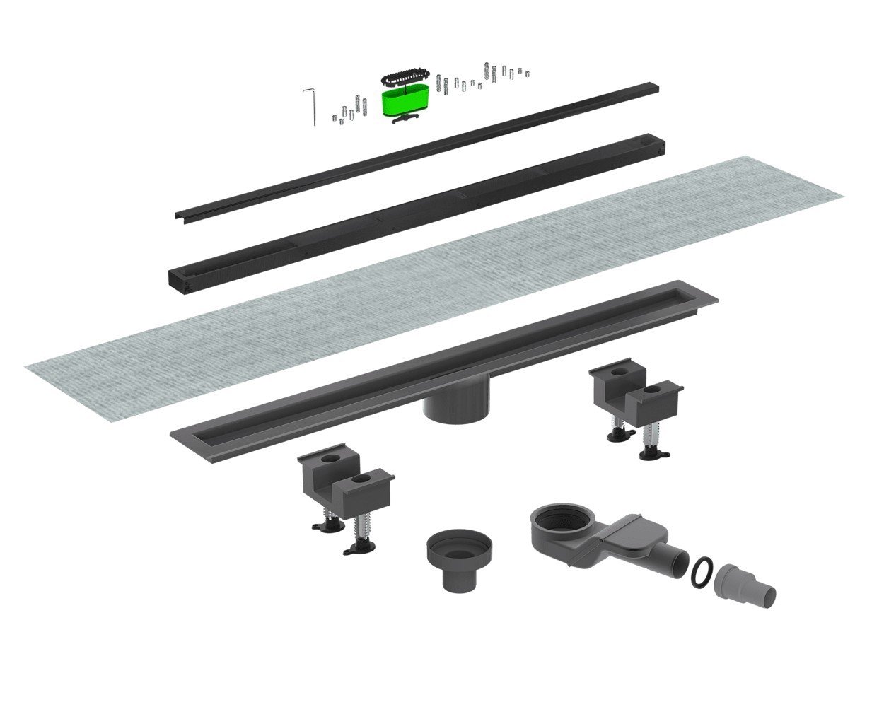 Линеен Сифон Подов Canalissima Double face 6825BL70S 70см. решетка неръждаема стомана AISI316 двоен дизайн плътна или за вграждане на плочка странично или или долно оттичане ф50мм. нивелиращи крачета преход от ф50мм. на ф40мм. хидроизолация клапа кошница за лесно почистване на отпадъци дебит 29.5л./мин. черен мат 6825BL70S/70см. DOUBLE Black matt