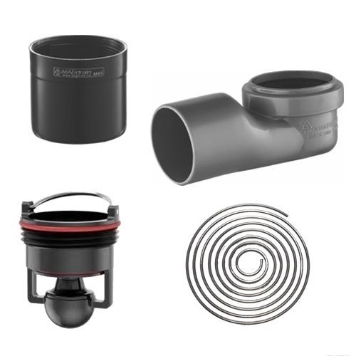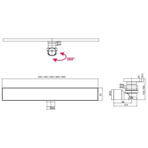Линеен сифон в цвят черен MAGdrain Duo Black с размери 90/5.5см. решетка двоен дизайн плътна или за вграждане на плочка неръждаема стомана SS304 с дебит 36 л/мин. Клапа против миризми. В комплекта е включено: коляно ф 50; клапан Q 50; муфа ф 50; кошничка за коса