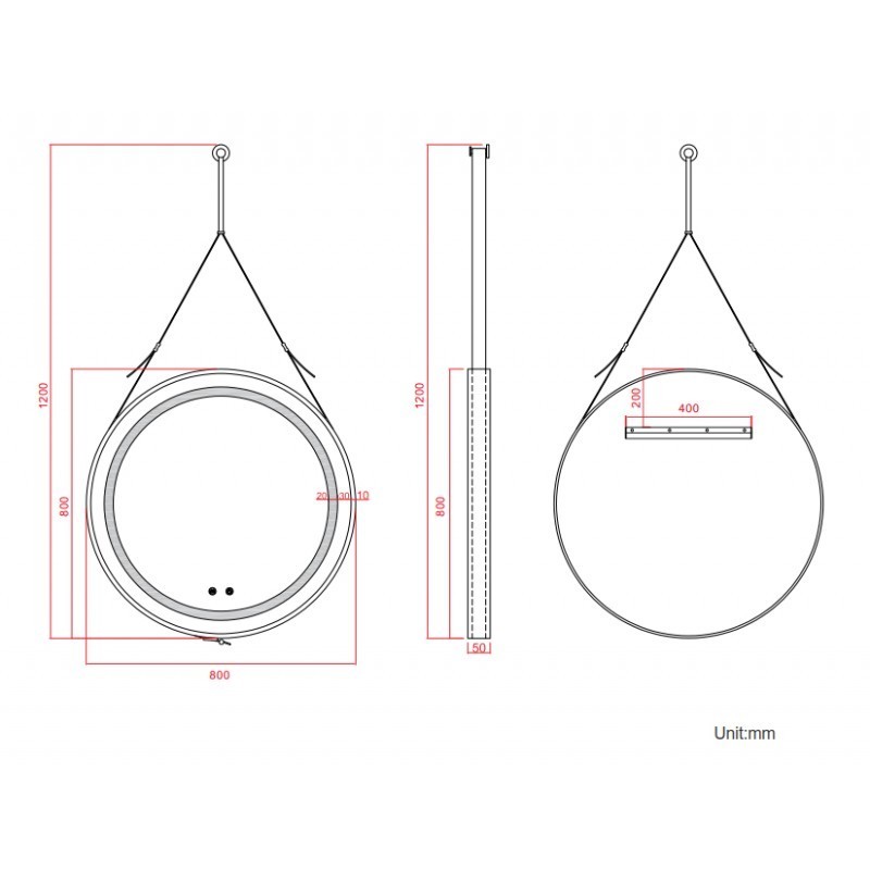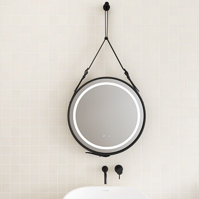 Огледало Catania-80 1398MB-80 ф80см. рамка и държач кожени цвят черен мат с вградено LED осветление Touch бутон 6500K IP44 2304LM дължина на LED лентата 200см. Нагревател Покритие против замъгляване вертикален монтаж с включени крепежни елементи и закачалка за стена черен мат 1398MB-80/6988354277276