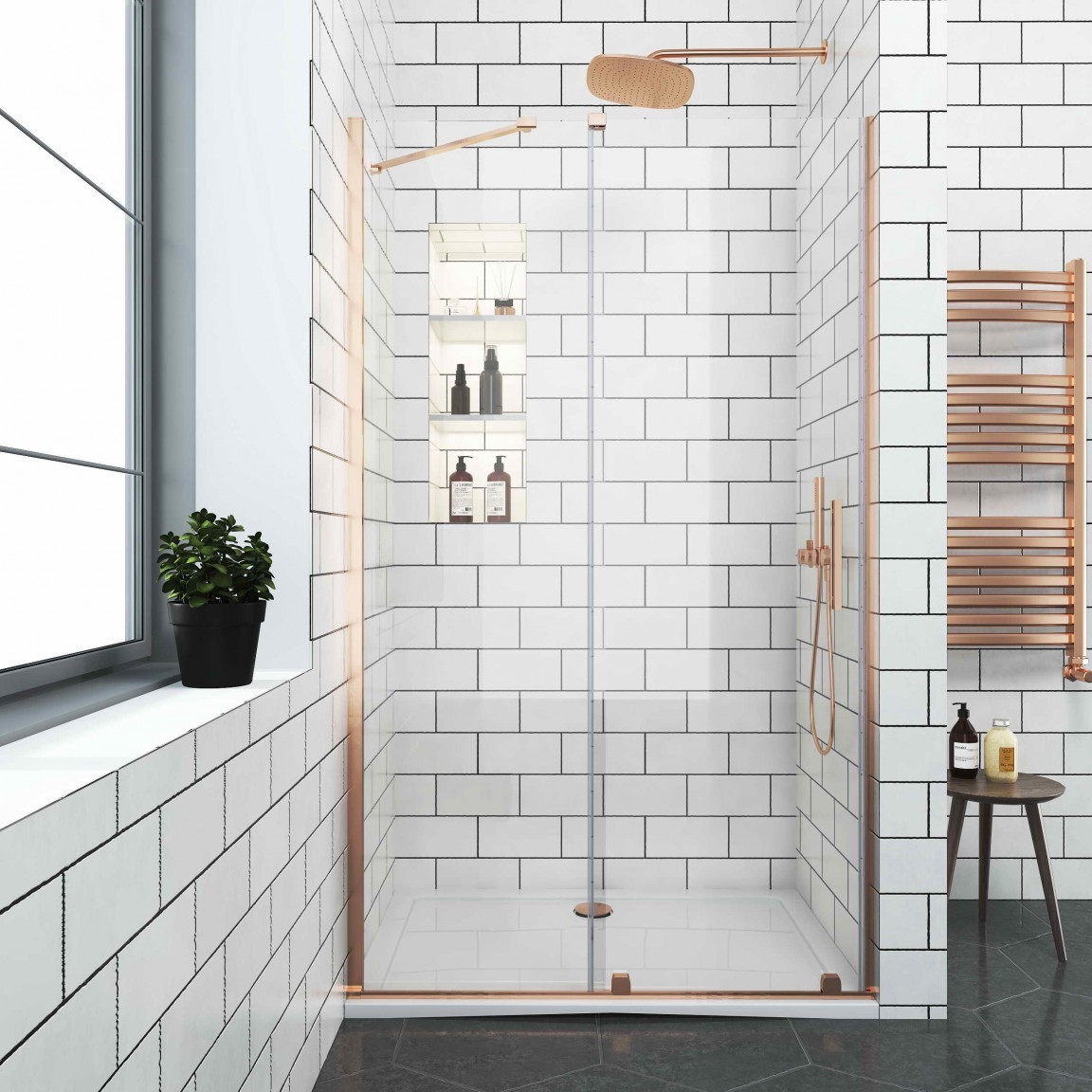 Параван Elgio BRG 8002-90BRG с размери 90/h200см. с една плъзгаща врата , кристално стъкло 8мм. с дръжка от неръждаема стомана, цвят розово злато и едно стационарно кристално стъкло 6мм. Държач телескопичен алуминиев профил розово злато матиран Реверсивен 8002-90BRG.