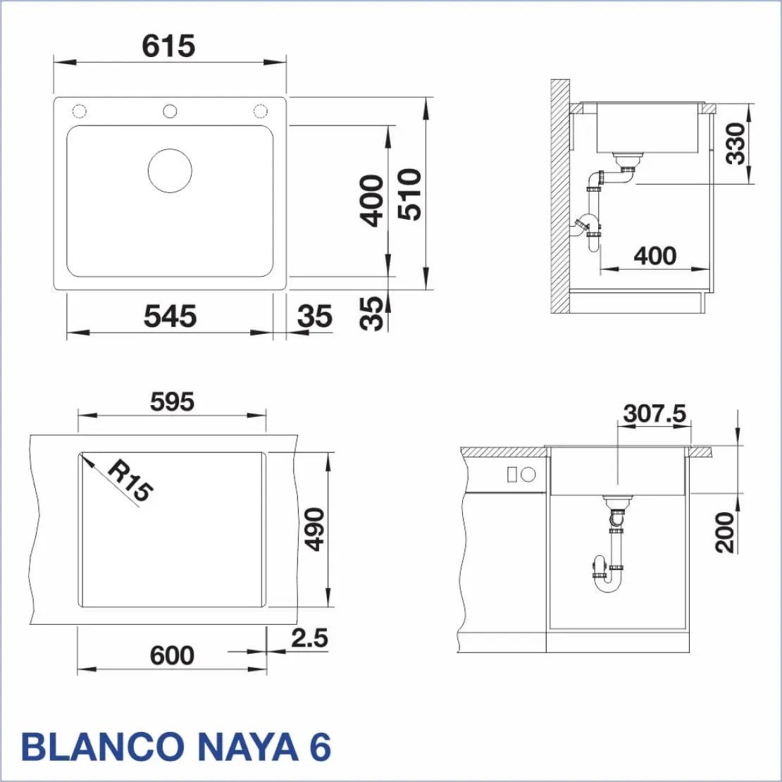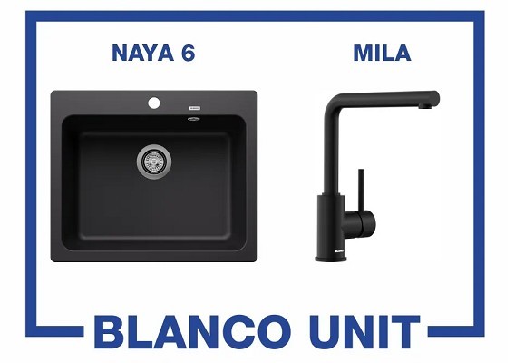 Промоционален комплект - Кухненска мивка Blanco Naya 6 с размер 61.5/51см. Модела е за монтаж в шкаф 60см. с преливник и сифон Silgranit в черен цвят. Смесител за кухня Blanco Mila с размер 8.1/21/h27см. стоящ едноръкохватков висок h=24.1см. въртящ чучур 360° в цвят черен мат. Забележка: Има включени крепежни елементи за мивката и включени гъвкави връзки за смесителя!