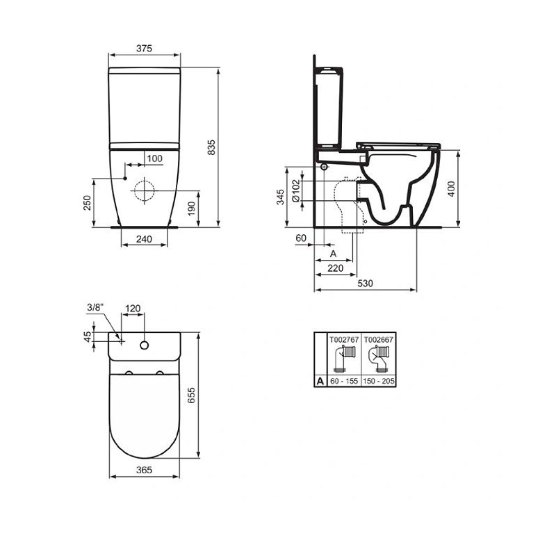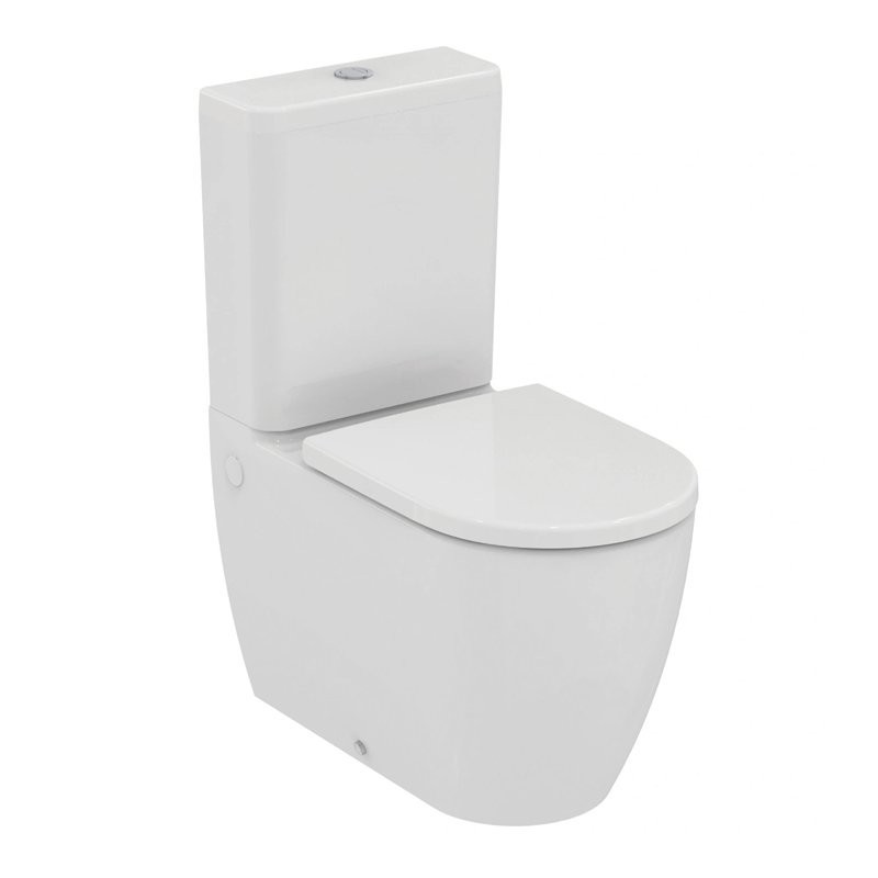 Промоционален Моноблок Ellisse с размери 37.5/65.5/h83.5см. плътно до стена. Тоалетната чиния е с размери 36.5/65.5/h40см. Rimless/Без ръб задно/хоризонтално оттичане порцеланово бяло Казанче 3/4.5 литра с долно водоподаване порцеланово бяло и капак забавено падане дуропласт бял. Промо T569601/White