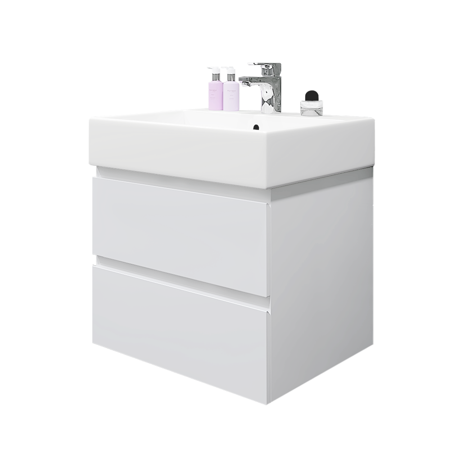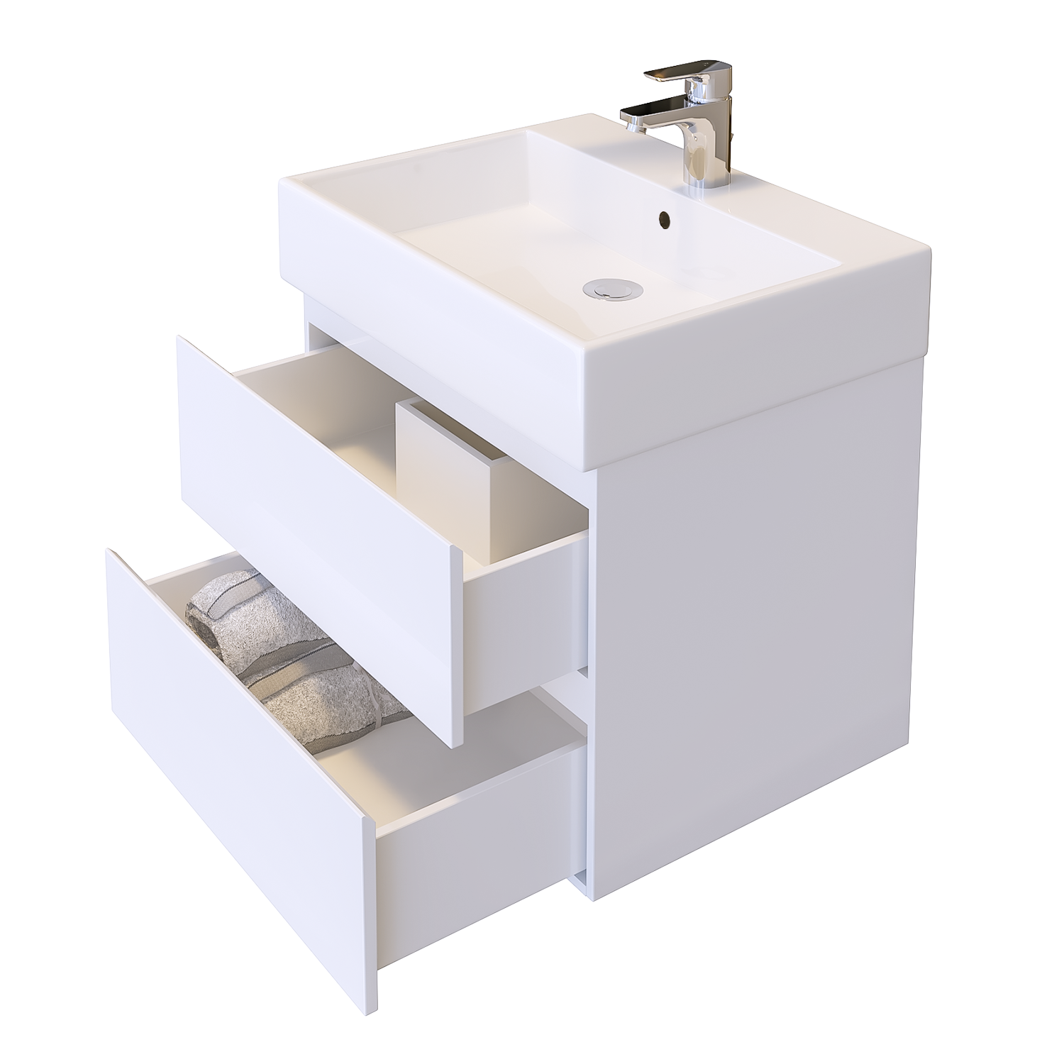 Шкаф д.ч. Гранд 60/48/h58см. Окачен PVC Бял две чекмеджета с механизъм soft close и мивка Sharp 60см./New Esvit 60 60/42см. порцеланова бяла с отвор за СМУ