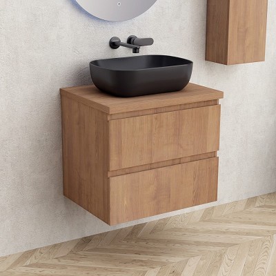 Шкаф долна част 6039-60 59/45/h50см. Окачен PVC дървесен цвят PS-001 с две чекмеджета без дръжки/с жлеб/ с DTC релси с механизъм soft-close с плот 6046-31 60/46/3см. PVC дървесен цвят PS-001 Без мивка и без отвор Асемблиран/сглобен BG6039-60+6046-31
