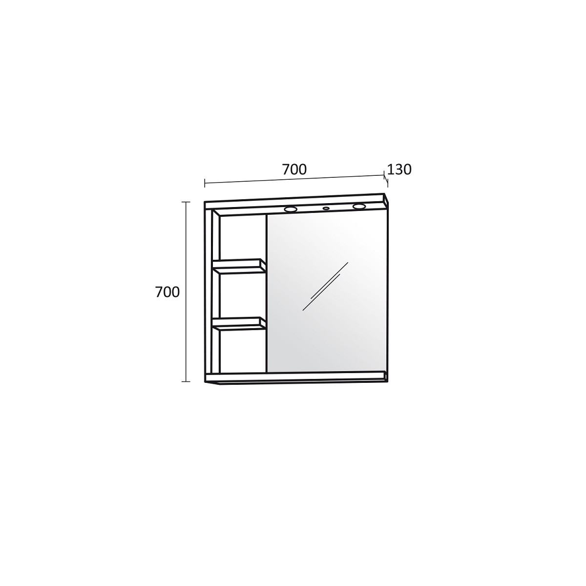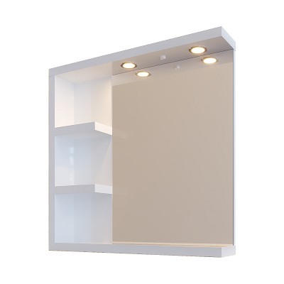 Шкаф с огледало Либеро с размер 70/13/h70см. Модела е от PVC в цвят бял. Огледало с Led осветление вграден. Ел.ключ и захранване 220V неутрална светлина 4000-4200К и два PVC рафтa.