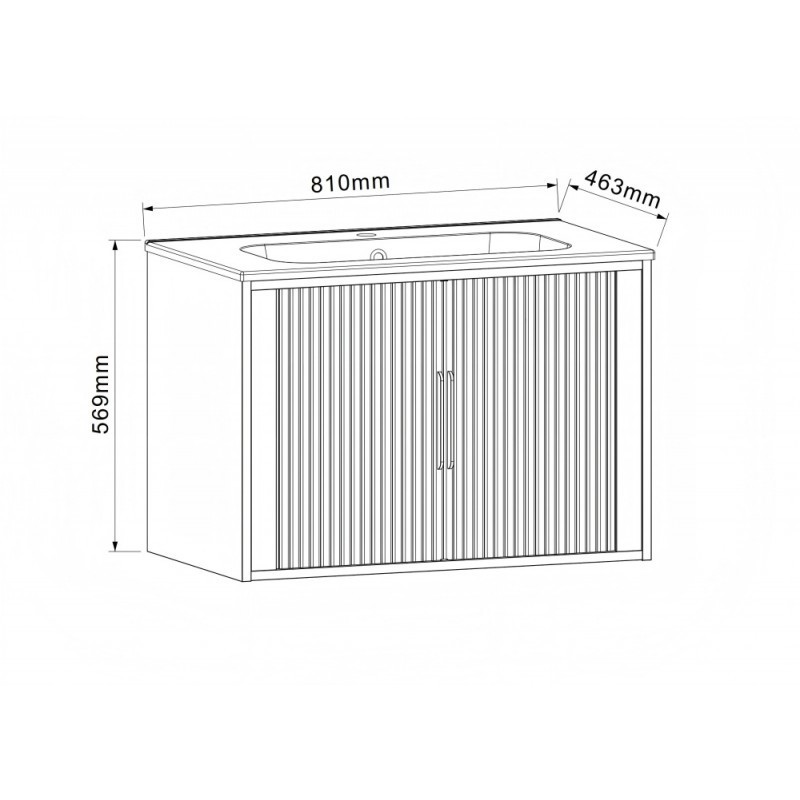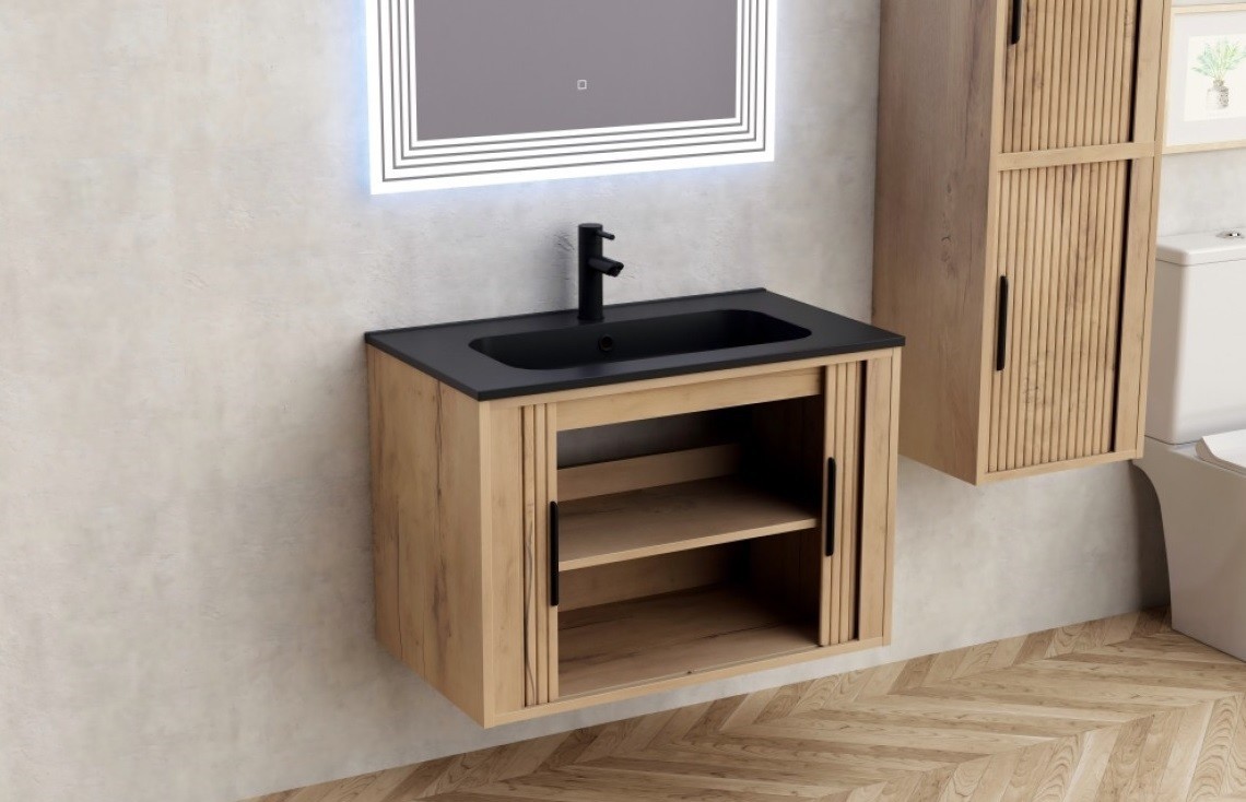 Шкаф за баня Arezzo 8045 Wooden с размери 81/46.3/h56.9см. Модела е от MDF Окачен дървесен цвят 2510. Състои се от две плъзгащи врати с алуминиеви релси и един вътрешен рафт дръжки черни и мивка от Solid Surface смола черен мат с отвор за смесител и преливник 8045Wooden/6988354273797
