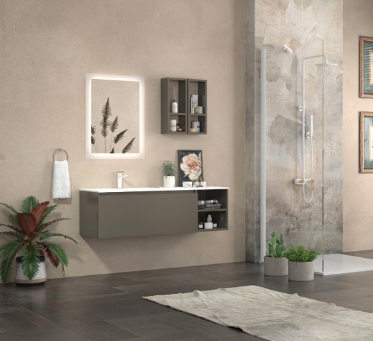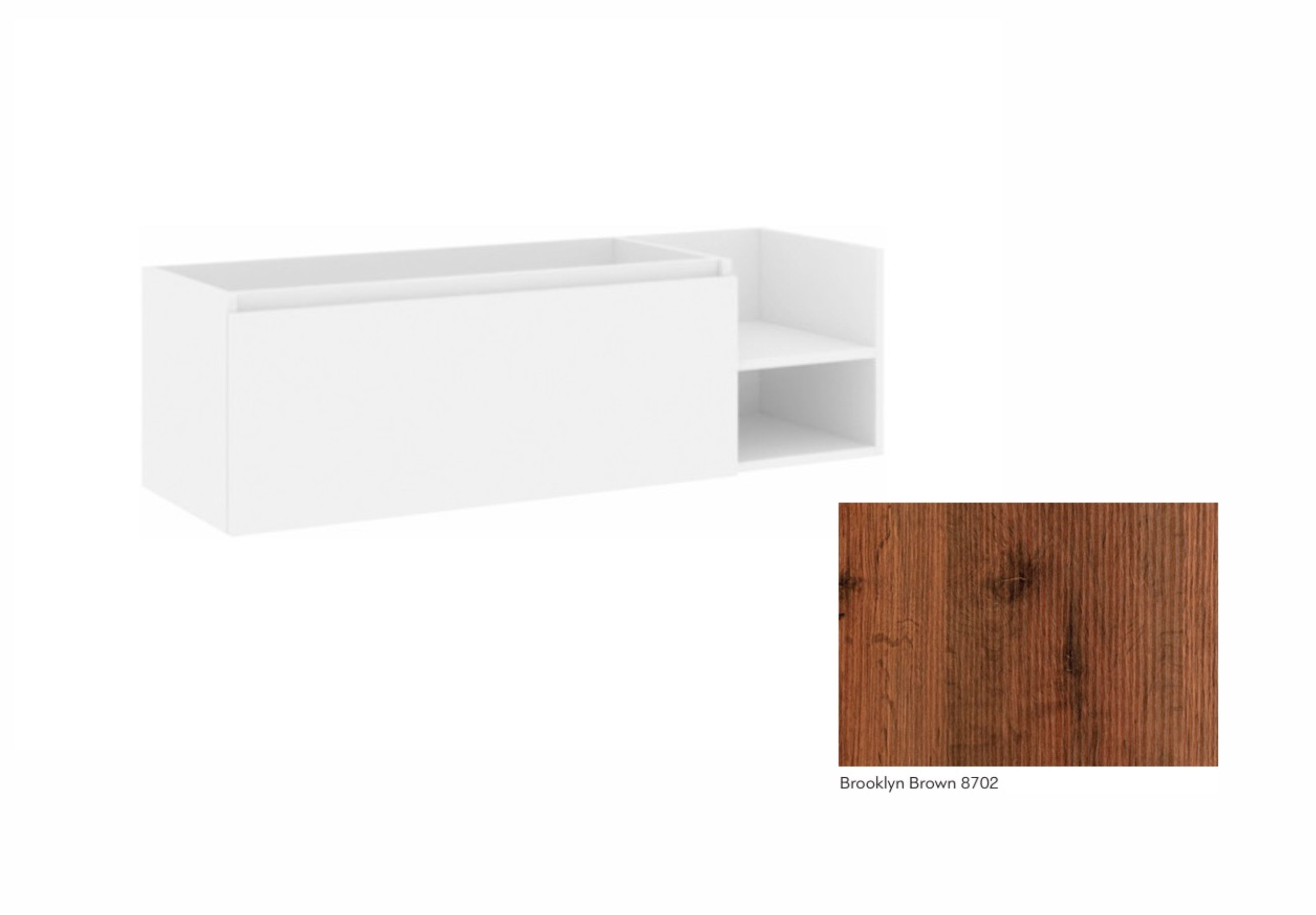 Шкаф за баня Space SP135M 133.5/45/h45см. Окачен MDF водоустойчив едно чекмедже с механизъм Soft close и два отворени рафта/ниши цвят Brooklyn Brown 8702 без мивка SP135M/5206836033365/Brooklyn Brown