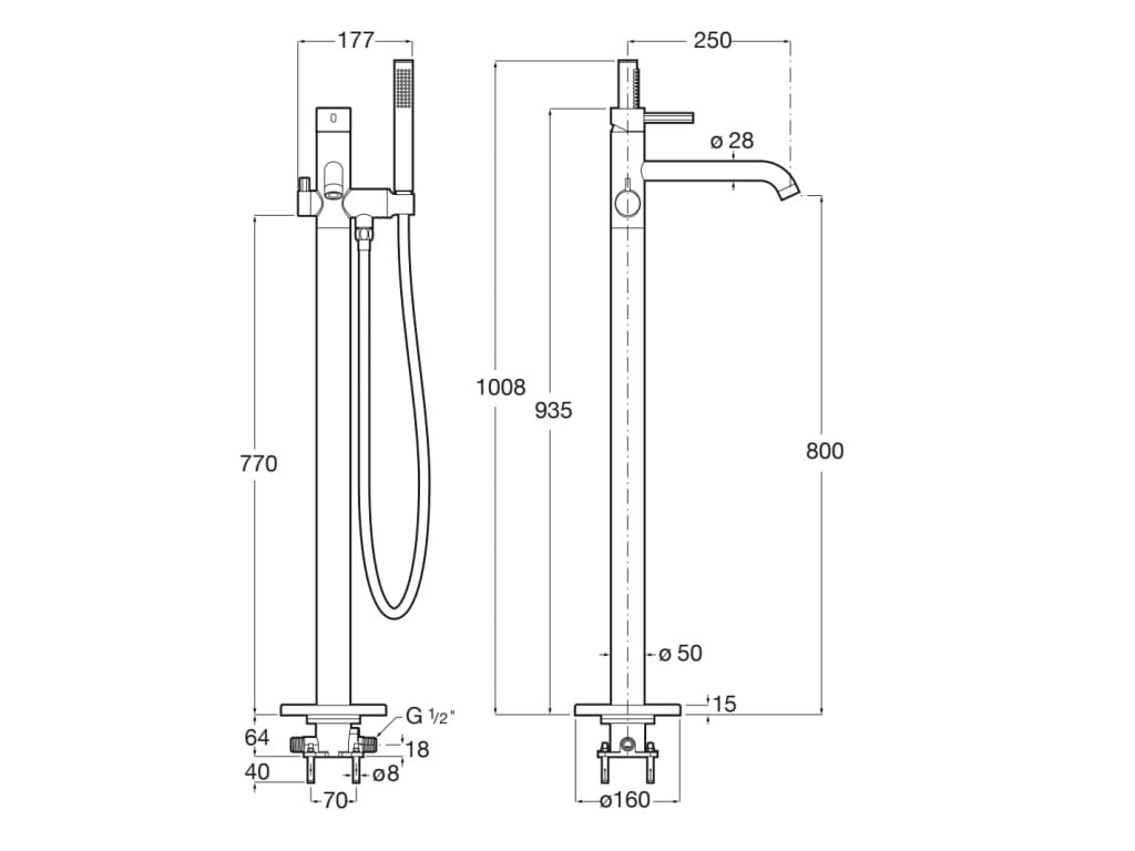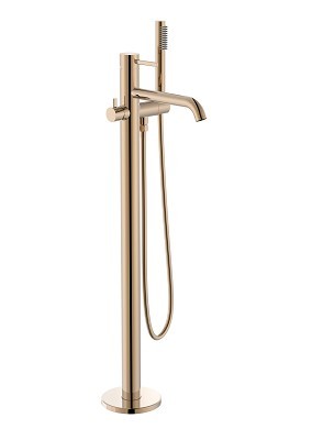 Смесител за вана/душ Ona стоящ от пода едноръкохватков с превключвател ръчен и с аксесоари душ слушалка окачалка стационарна и шлаух розово злато A5A279ERG0/Rose Gold Забележка: Окомплектова се с Кутия за СМВ/Д Ona стоящ от пода вътр.част A525231803