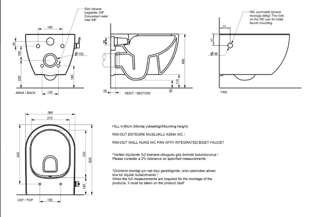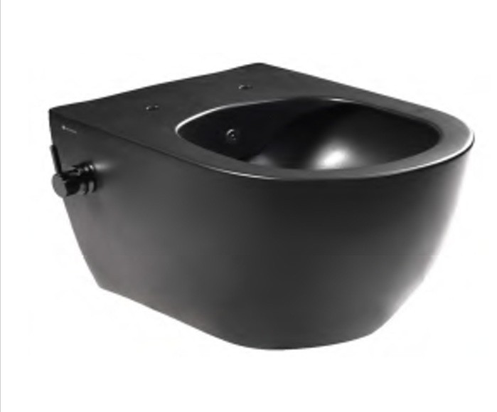 Стенна тоалетна чиния Hill 36/52/h35см. Rimless без ръб порцеланова черен мат с биде система вграден смесител за топла и студена вода A031156H/Black matt Забележка: окомплектова се с капак SERAMIKSANBANYO19037