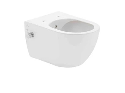 Стенна тоалетна чиния Hill 36/52/h35см. Rimless без ръб порцеланова бяла (гланц) с биде система вграден смесител за топла и студена вода A031155H Забележка: окомплектова се с капак