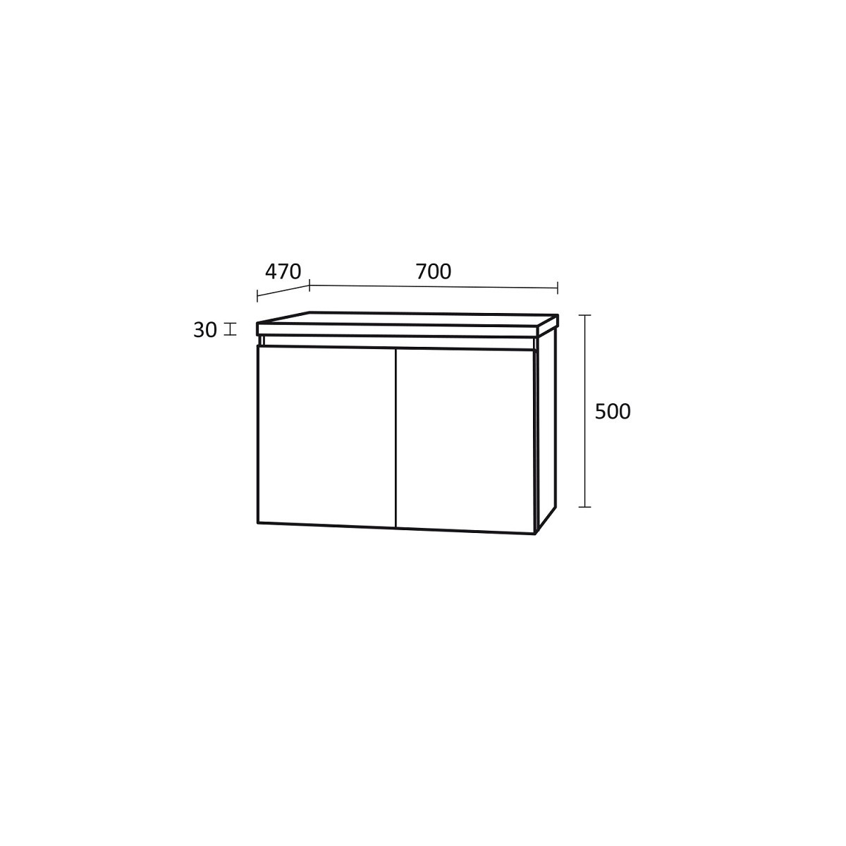 Шкаф долна част Либеро с размери 70/47/h50см. Окачен PVC в цвят бял гланц. Две врати бели с механизъм soft close с панти от неръждаема стомана и плот бял гланц. Без мивка с възможност за монтаж на мивка по избор. Забележка: с включени крепежни елементи.
