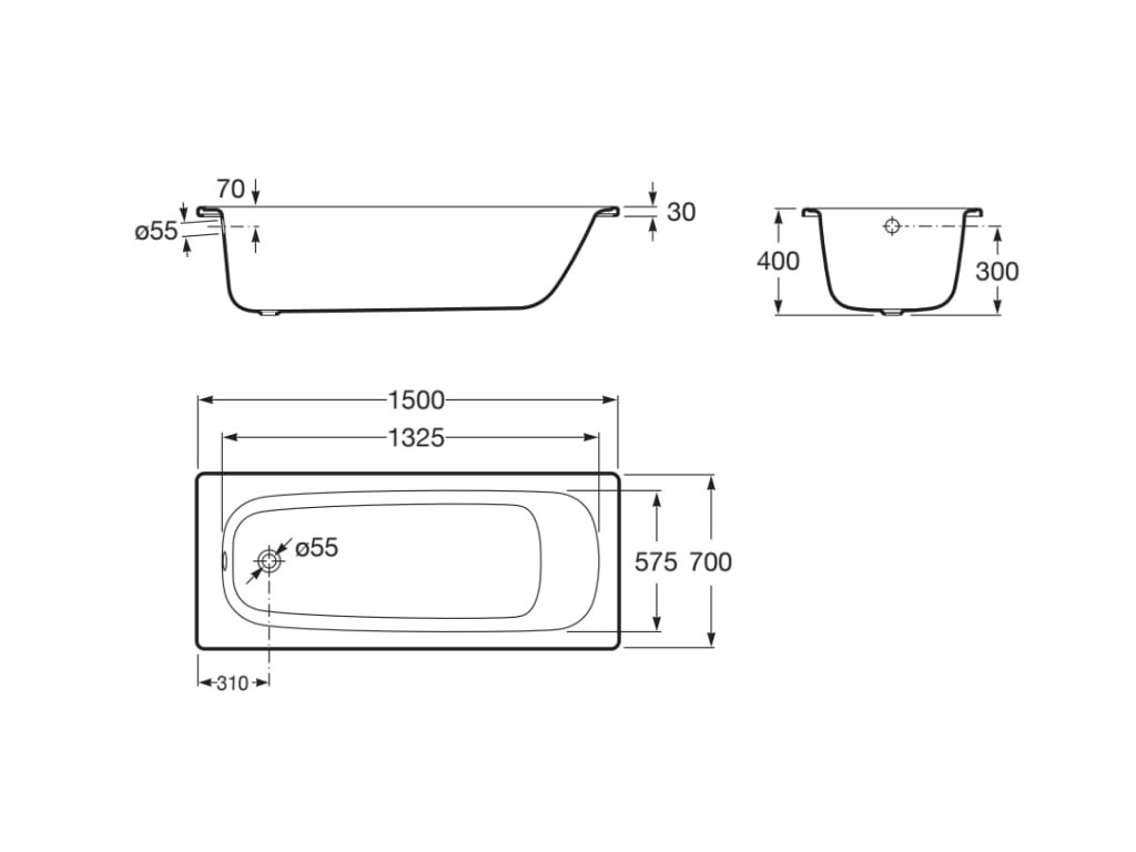 Правоъгълна вана за вграждане с едно лежащо място и вместимост 153 литра.